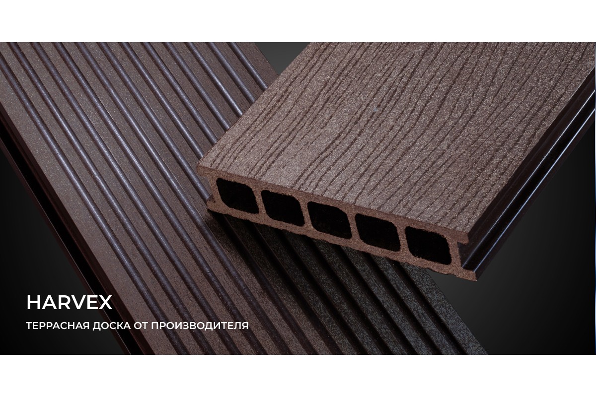 2% - красительСырье (полиэтилен и древесная стружка) проходит дополнительное измельчение до стояния муки, это делается для того, чтобы добиться более качественного смешивания и соединения на молекулярном уровне полиэтилена и древесной муки. Это увеличивает плотность, снижает пористость материала. Так же в ходе производства добавляются импортные компоненты, такие как краситель, ультрафиолетовые стабилизаторы, дополнительные компоненты для увеличения влагостойкости. Таким образом доска превосходно переносит сильно отрицательные температуры, имеет высокую стойкость к выгоранию и длительный срок эксплуатации. Террасная доска имеет одну рабочую сторону с мелким вельветом. Рисунок с мелким вельветом хорошо себя зарекомендовал для применения в дизайнерских проектах. Harvex Nova имеет классический вид, меньше подвержена скольжению.