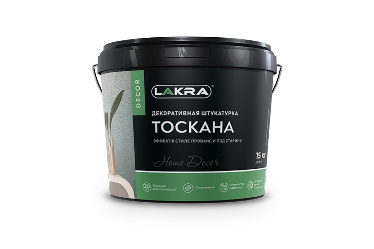 Декоративная водно-дисперсионная моделируемая фактурная штукатурка с волокнами целлюлозы для отделки стен в прованском, средиземноморском стиле или под старину, имитирующая эффекты камня, самана, мазанки и множество других. Образует воздухопроницаемое прочное покрытие высокой белизны. Скрывает дефекты основания. Имеет небольшой расход, пластичная, легкая в нанесении различными инструментами. Экологичная, не содержит органических растворителей, без запаха. Готова к применению. Легко реставрируется. Защитно-декоративный финишный лак ЛАКРА ДЕКОР, заколерованный в желаемые оттенки, выделит и подчеркнет рельеф и красоту покрытия, защитит от загрязнения.