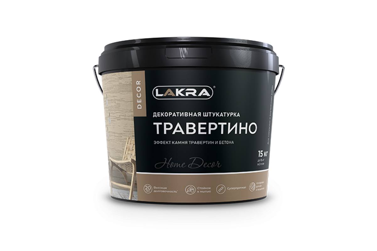 Декоративная водно-дисперсионная фактурная штукатурка, имитирующая эффекты натурального природного камня Травертин, бетона, римской кладки, карты мира и множество других. Образует долговечное воздухопроницаемое прочное покрытие с характерной фактурой. Обладает стойкостью к атмосферным воздействиям, к механическим воздействиям и мытью. Имеет небольшой расход, легкая в нанесении. Экологичная, не содержит органических растворителей, практически без запаха. Готова к применению. Защитно-декоративный финишный лак ЛАКРА ДЕКОР, заколерованный в разные оттенки, выделит и подчеркнет рельеф и красоту покрытия, а также защитит от загрязнения.