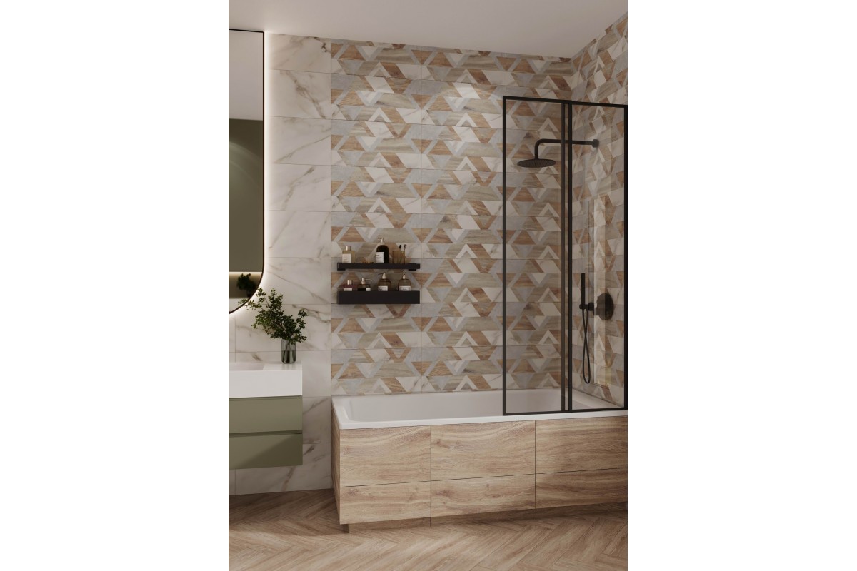 Керамическая плитка, имитирующая текстуру дерева, в белых и коричневых оттенках. Формат 600×300 мм позволяет использовать плитку для стен в ванной, кухне, прихожей и гостиной. Матовая поверхность обеспечивает практичность и лёгкость ухода, а декоративные элементы добавляют изюминку интерьеру.