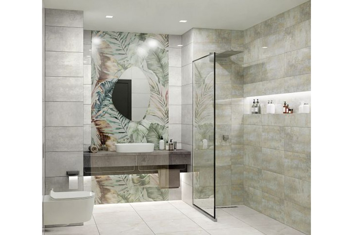 Infinium – это манифест современного дизайна, который смело объединяет красоту бетона и изящные мотивы природы. Три глянцевые, керамические плиты формата 30х60, имитирующие бетонную поверхность, задают тон всему пространству. Глянцевое покрытие придает плитке элегантность, играя отблесками света и визуально увеличивая пространство. Эта коллекция – идеальное решение для создания интерьера в стиле лофт или современного минимализма. Простота и лаконичность форм, присущие бетону, гармонично сочетаются с функциональностью и практичностью керамогранита. Центральным элементом коллекции является керамогранитная плита 60х120. Эффект Digital гранильи создает объем, привнося в интерьер ощущение природной нежности. Контраст между текстурой бетона и изящными очертаниями растений придает коллекции особый шарм, делая ее по-настоящему уникальной.